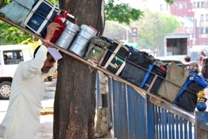 Dabba- Wallahs, that’s how the food carriers are called who bring homemade food from the suburbs and rural areas into the city. Most of the families live outside, up to two hours away. The men leave early, the trains in the rush hours are over-crowded. In the meantime, their wives start to prepare fresh hot food that the Dabba-Wallahs bring then to the men working in Mumbai city. Day by day. They collect it locality- wise and – by using the train after the first rush hours – they bring it to the city. Once the train arrives at the station they carry entire food collections – up to hundred kilos of food (!) – on their heads down to a street where they start to re-order the food containers according to the destination address. The food arrives warm at the husbands’ desk . It is a wonder: the delivery system fails only in very rare cases. After lunch has taken place the containers are carried home – in the same way.