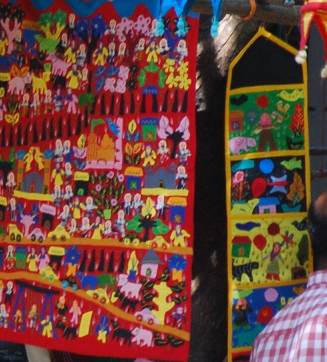 When I came closer, I could see that he was creating a rural life picture, piece by piece with a lot of patience. He was concentrated so that in a first moment he did not even notice that I observed him and his work. Then he smiled and started to talk, explaining what he was working on. His work was impressive. Colorful, showing many details, reflecting many particular situations of rural life. But it was even more – it was showing a vision how Indian life could look: healthy and lively cows and goats, women and men staying and talking together, children playing with balloons…