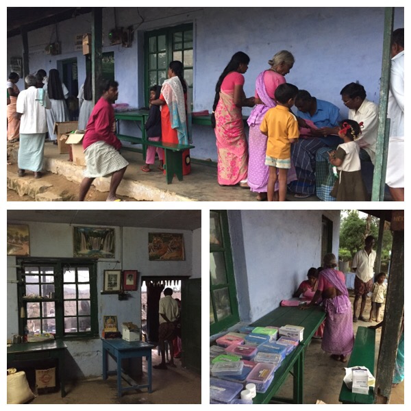 The sisters who are trained nurses put a big bag with medicines from the car roof to a table in front of a labour meeting hall consisting of three large rooms. It might be the only community building in this village. There are four rooms. The kitchen where fresh tea is prepared, an empty room, but decorated with a lot of Indian-like pictures. One of them shows a mosque, Ganesha and Jesus all together. In the third room the doctor starts to check the health status of all people coming – after they have registered outside. The room is normally used as ration room – most of the villagers live under the poverty line of 32 rupees a day, that’s 5o cent. They get rice for free. And sugar and wheat for a low price. In the storage room aside it smells strong: carosin is there for cooking. For the people it is very hard to transport those things from Valparai here. They are happy that now done essential food and carosin is brought by a lorry …