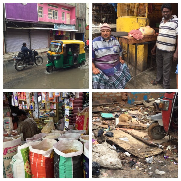 full of huge gaps, now filled with water. Broken pathways, craftsmen climbing up on dangerous structures. Many chickens in small cages, some goats are tied to shops.