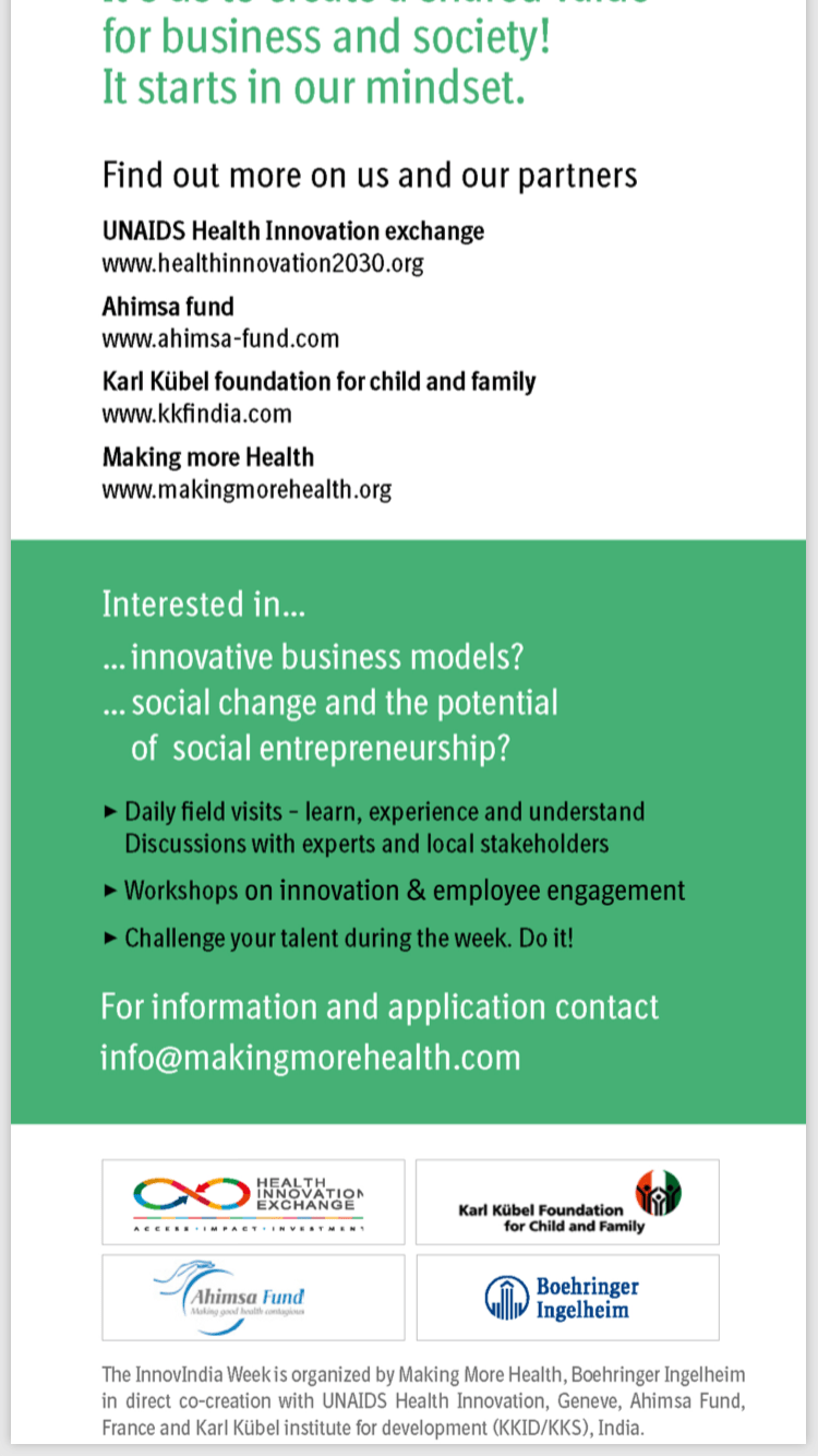 Together with UNAIDS, Ahimsa Fund and the Karl Kübel Institute for development education we offer a very exciting program for all decision makers and managers who are involved in innovation, leadership and social entrepreneurial topics.
