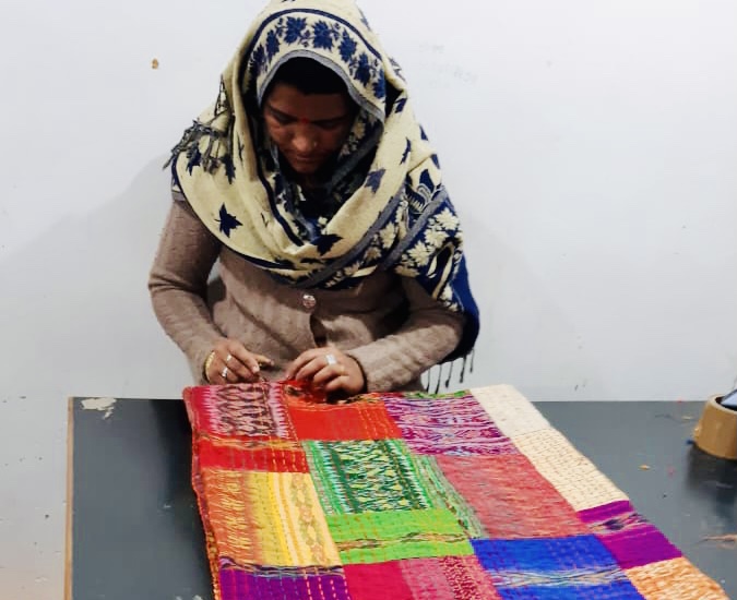 The woman in the villages buy old dresses & sarees with embroidered work on and upcycle it while producing table runners and wall pictures.