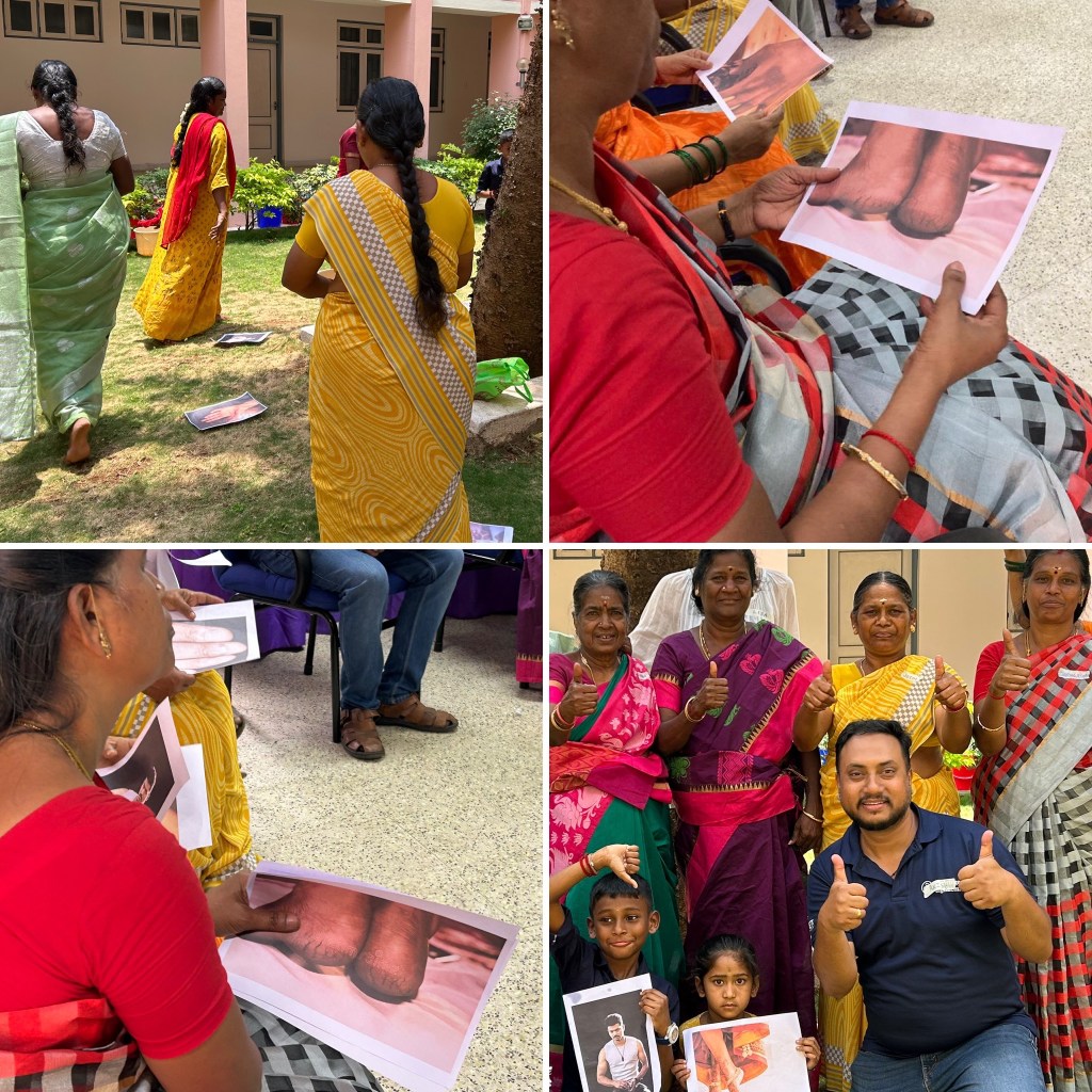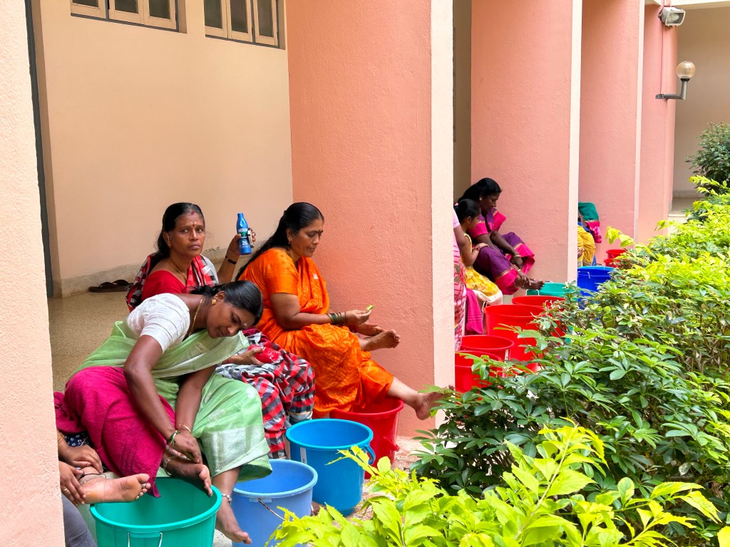 One task was to develop a training session themselves and to implement it. The topic this time: “do a training with people living at the poverty line on feet and skin hygiene and care. Make it with materials which are available to all, build trust and interact.” In smaller groups three community groups were trained for ca one hour.